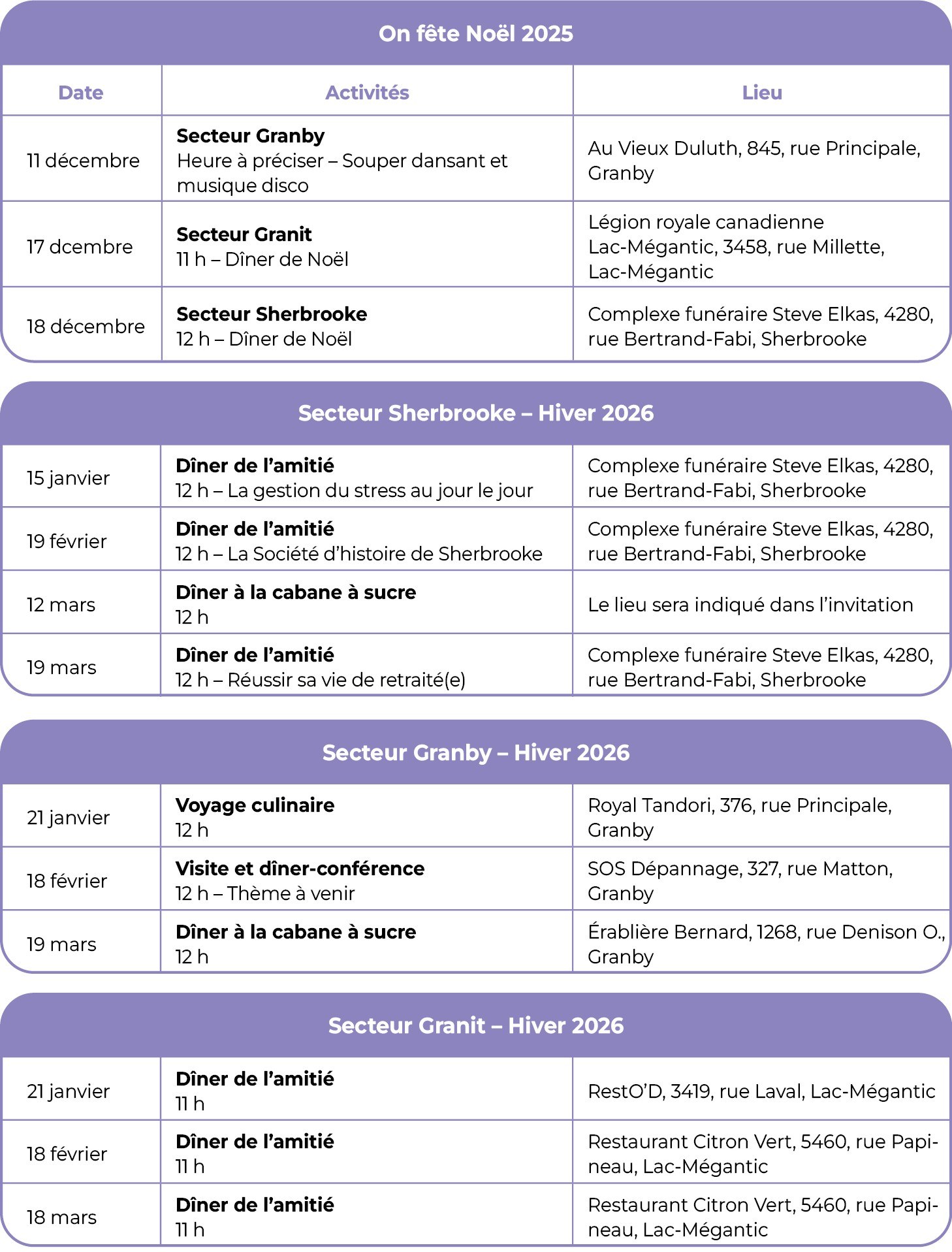 - Enfin, au moment où je rédige ces lignes, 42 membres du secteur Sherbrooke prévoyaient se réunir le 16 octobre au Complexe funéraire Elkas, à Sherbrooke, pour un dîner-conférence mensuel portant sur La Rose des vents, un organisme qui aide les personnes adultes atteintes de cancer et leurs proches à mieux vivre avec la maladie.
