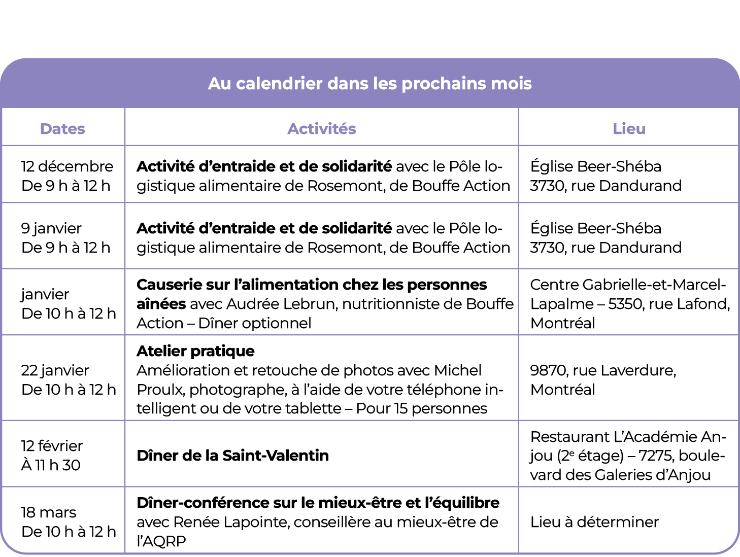 Notez que la Causerie sur l'alimentation se tiendra le 15 janvier 2026, de 10 h à 12 h.