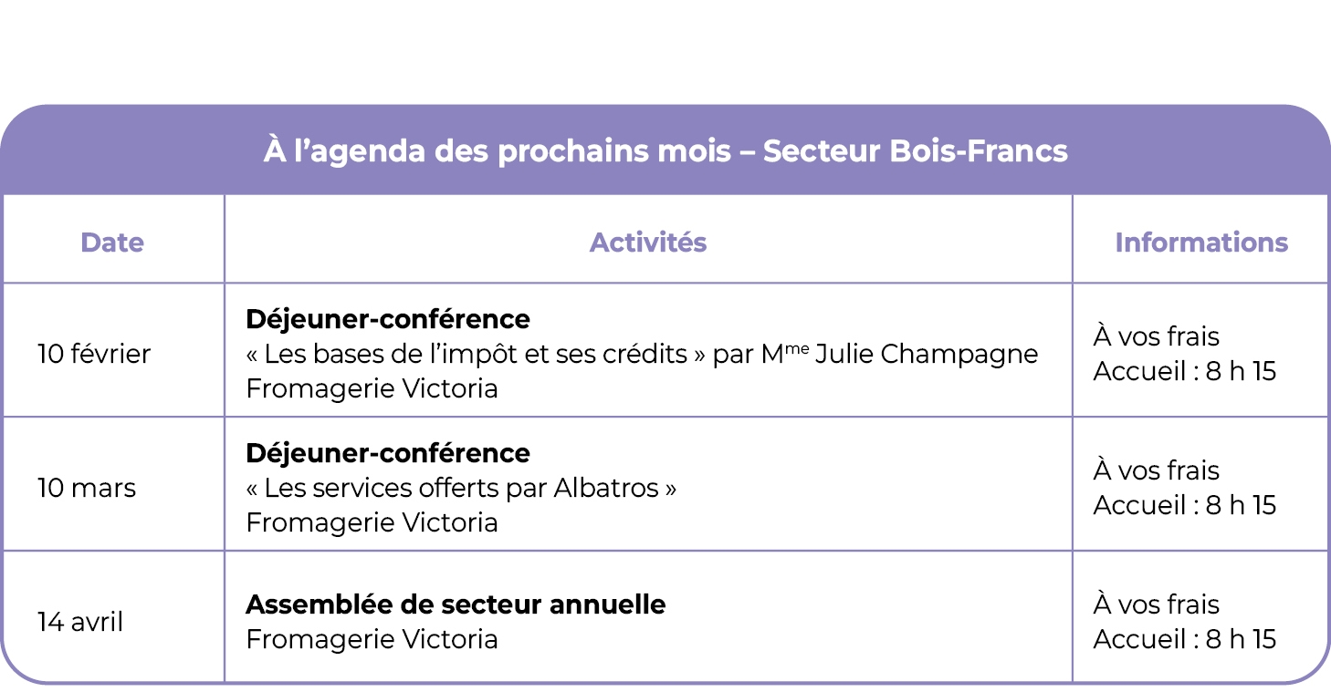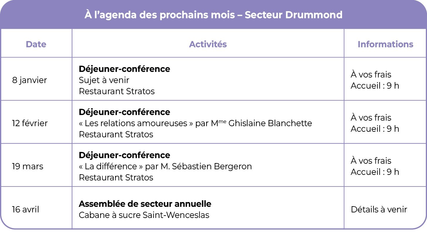 Les membres des conseils de Bois-Francs et de Drummond travaillent sans relâche afin d’organiser des activités pour tous les goûts. Nous sommes ouverts à toutes les suggestions pouvant nous aider à élaborer des calendriers de loisirs diversifiés.
