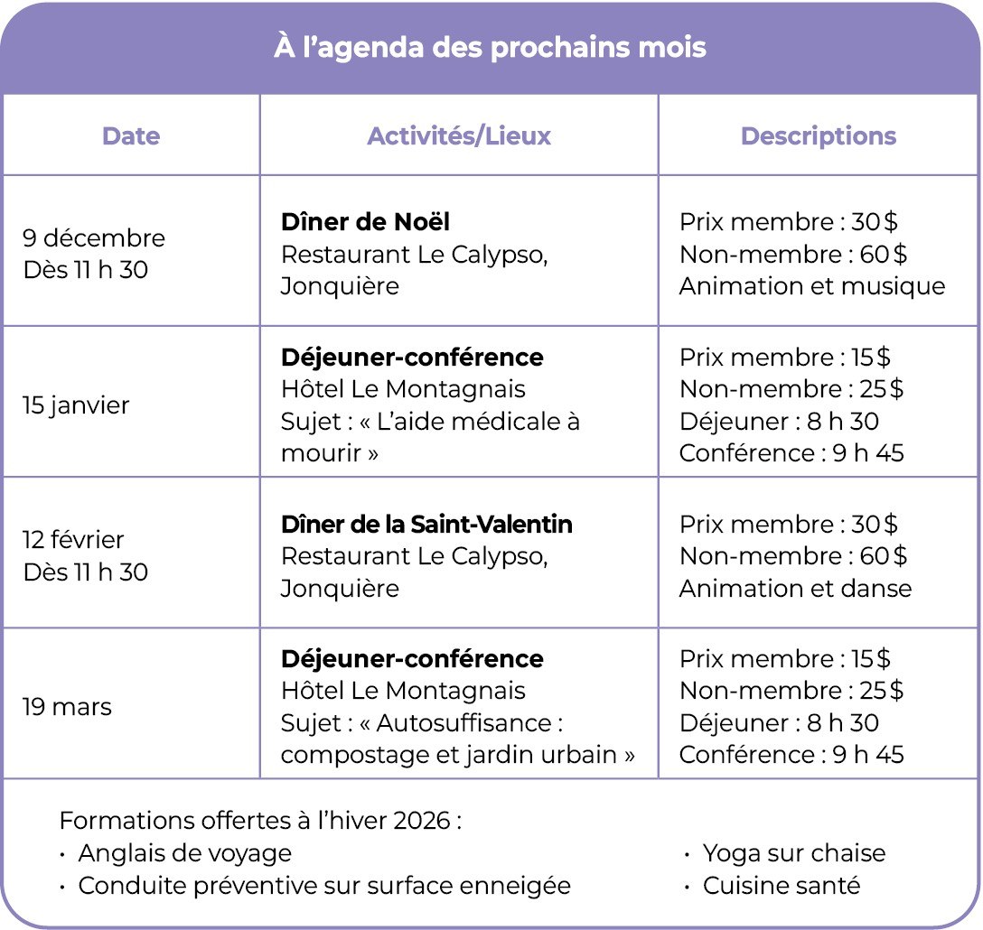 Dans notre région, l’automne aura été rempli d’activités de toutes sortes : formation en prévention des chutes, « cardiocerveau », cours de cuisine, etc., sans oublier les sorties, les déjeuners-conférences et notre traditionnel souper de Noël.