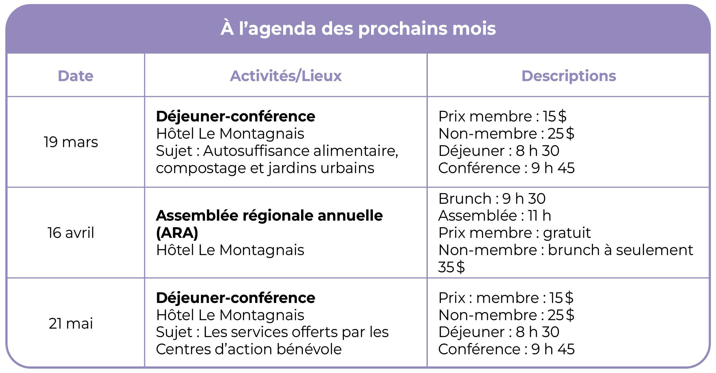 Lorsque vous lirez ces lignes, plusieurs activités seront chose du passé, mais il en reste encore beaucoup à venir. Le déjeuner-conférence de mars portera sur l’autosuffisance alimentaire, le compostage et les jardins urbains, et celui de mai vous permettra de découvrir les services offerts par les Centres d’action bénévole.
