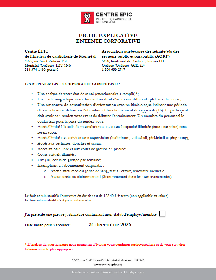 Pour en savoir plus sur les avantages de l'abonnement corporatif : Fiche explicative - Centre ÉPIC Institut de cardiologie de Montréal - 1er janvier au 31 décembre 2026