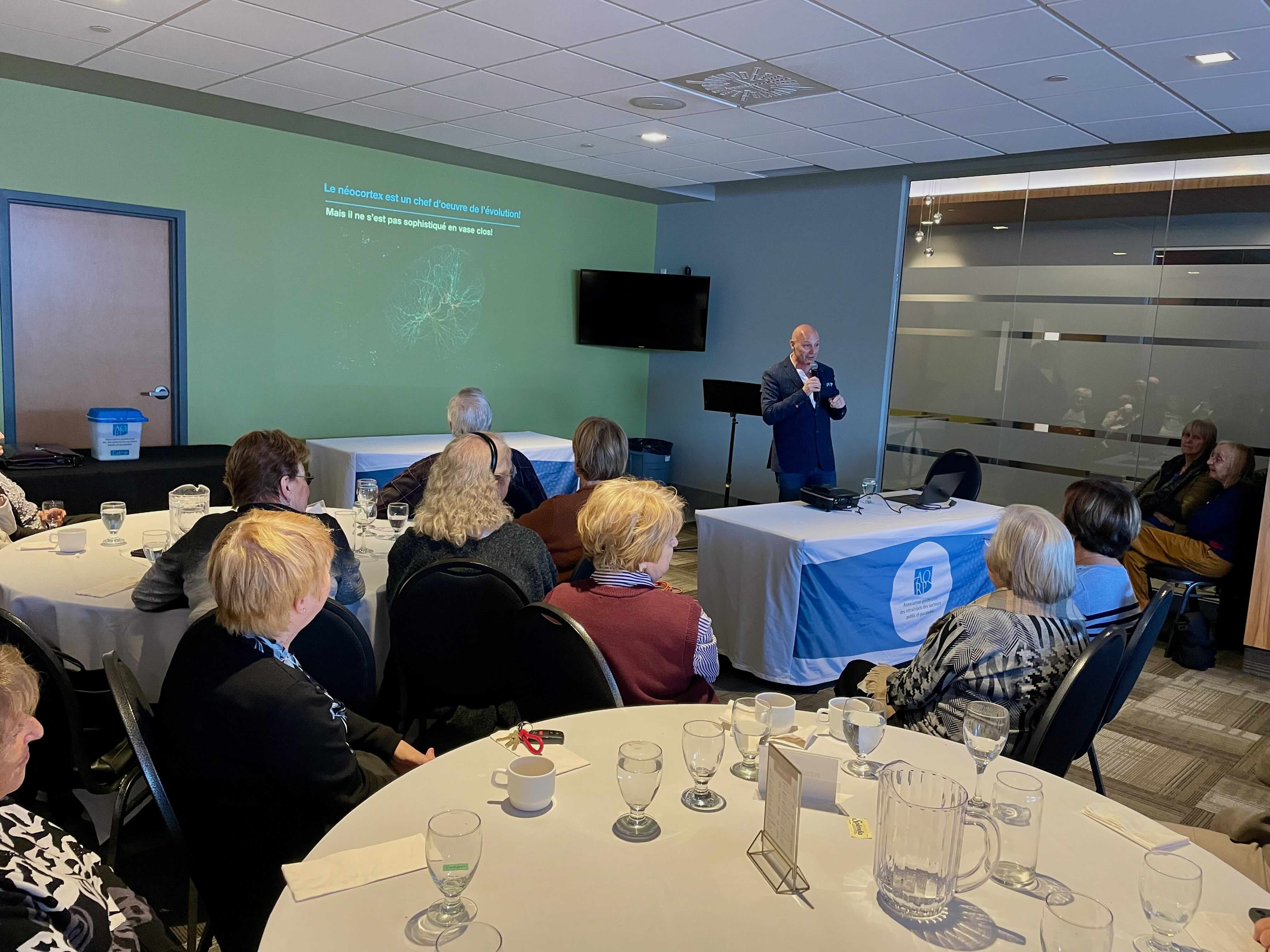 Le 20 novembre dernier, une centaine de membres du Secteur Sherbrooke, 98 pour être plus précis, se sont réunis pour leur dîner conférence mensuel au Complexe funéraire Elkas, à Sherbrooke. Le conférencier était le Dr David Fortin, éminent neuro-oncologue du Centre hospitalier universitaire de Sherbrooke et professeur à l’Université de Sherbrooke. Celui-ci nous a captivés par son exposé accompagné de documents audio visuels sur les complexités du cerveau. Il a su également nous convaincre que les développements récents de l’intelligence artificielle sont certes impressionnants, mais nullement ‘intelligents’.