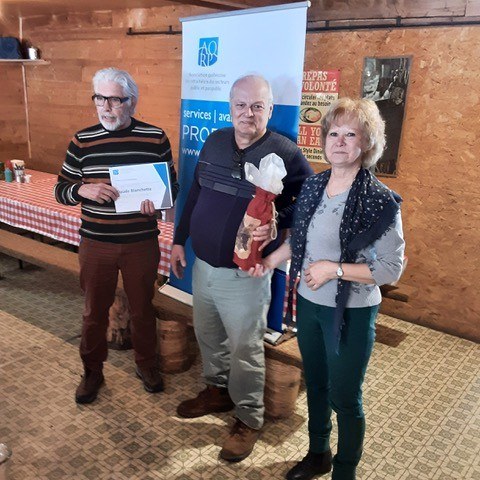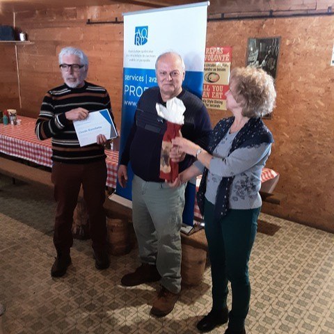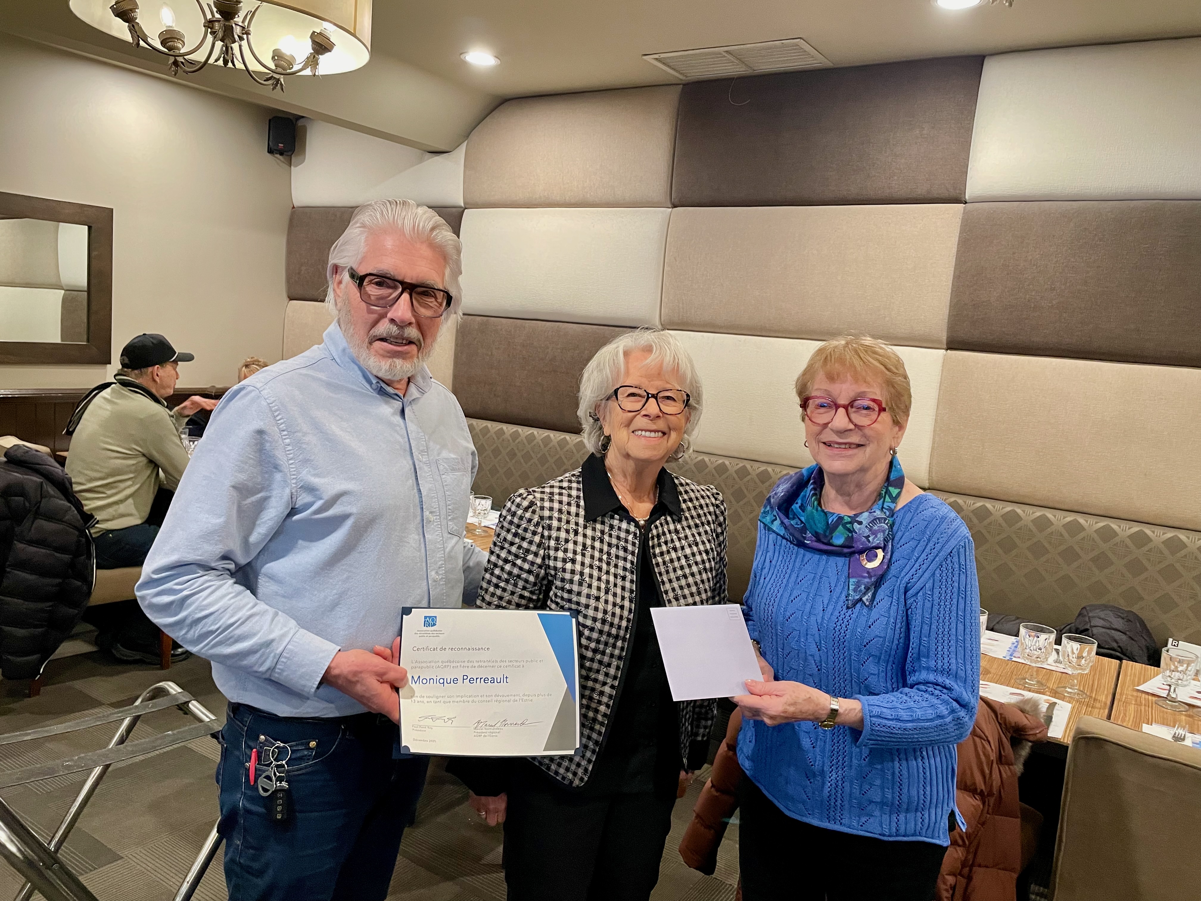 C’est à l’occasion d’un dîner au restaurant Au vieux Duluth de Sherbrooke le 16 décembre que le Conseil régional de l’Estrie a témoigné de l’engagement de différent(e)s bénévoles qui se sont illustré(e)s au service des membres de la région de l’Estrie durant l’année 2025. Ces remerciements sont bien mérités, que ce soit pour leur participation à la tenue de diverses activités régionales, leur soutien à la tenue des élections lors de l’Assemblée régionale annuelle d’avril ou leur contribution substantielle au succès retentissant de l’Assemblée générale annuelle de l’AQRP tenue à Sherbrooke en juin dernier. Par la même occasion, un certificat de reconnaissance nationale a été attribué à Mme Monique Perreault en vue de souligner plus de 13 années d’implication et de dévouement à titre de membre du Conseil régional de l’Estrie.